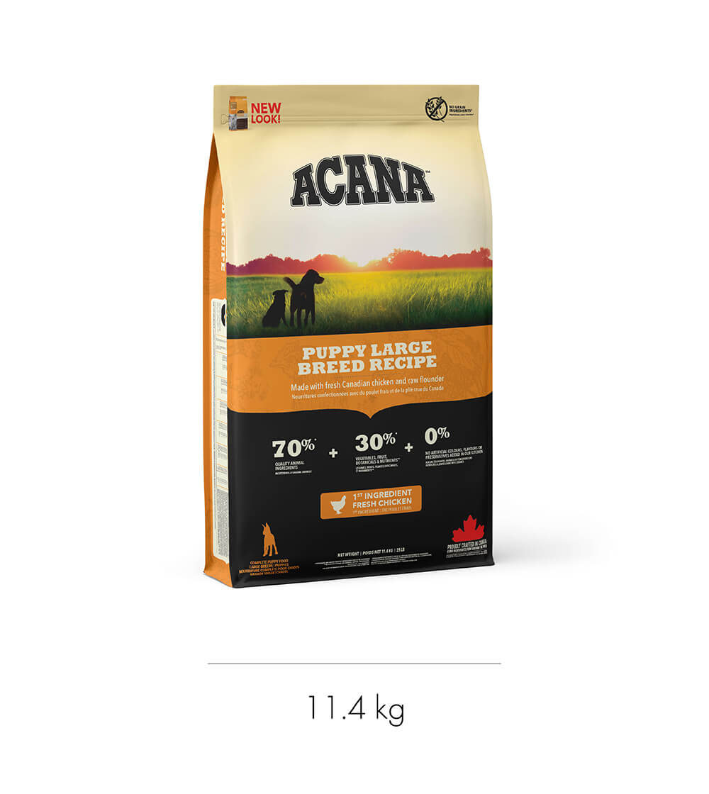 「ACANA(アカナ)パピーラージブリードレシピ」は、大型犬・超大型犬の子犬が元気に成長できるよう、原材料調達から調理まで考え抜いて作られています。