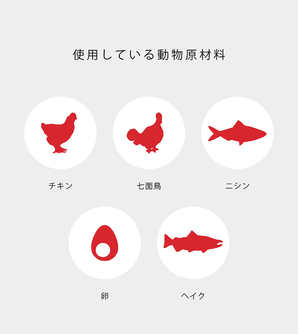 | 保証成分値 | 粗たんぱく質:33%以上、脂肪分:15%以上、粗繊維:6%以下、粗灰分:7%以下、水分:12%以下、カルシウム:1.4%以上、リン:1.0%以上、オメガ6:2.4%以上、オメガ3:1.2%以上、DHA:0.4%以上、EPA:0.4%以上 |