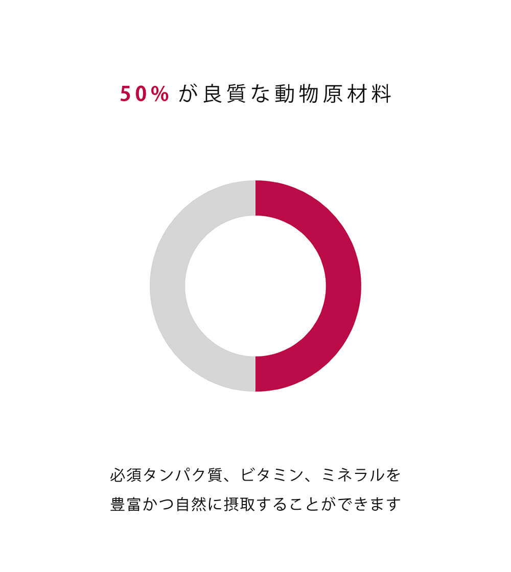 ※ホールプレイ:肉食動物が摂るべき食事に合わせた割合で、肉や魚といった動物原材料の内臓部分(心臓、レバー、腎臓など)・少量の骨をそのまま使用すること