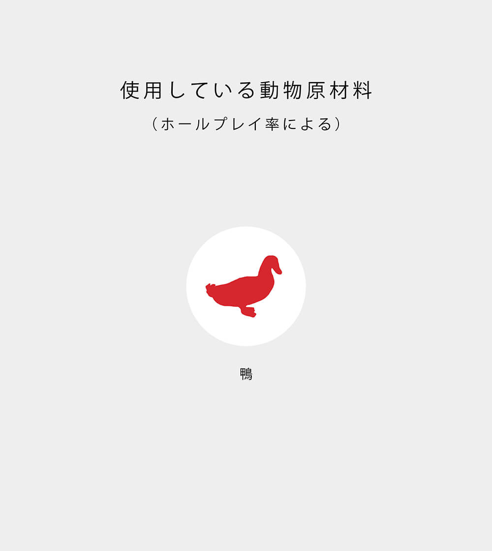 生鴨肉(18%)、鴨ミール(17%)、丸ごとグリーンピース、丸ごと赤レンズ豆、生鴨レバー(9%)、鴨脂肪(6%)、新鮮洋梨(4%)、丸ごとヒヨコ豆、丸ごと緑レンズ豆、丸ごとイエローピース、エンドウ豆スターチ、レンズ豆繊維、海藻(EPAとDHAの供給源)、新鮮丸ごとバターナッツスクワッシュ、新鮮丸ごとカボチャ、乾燥ケルプ、塩、乾燥チコリールート、丸ごとクランベリー、丸ごとブルーベリー、ターメリック、オオアザミ、ゴボウ、ラベンダー、マシュマロルート、ローズヒップ 酸化防止剤:1b306(i)植物油から抽出したトコフェロール:110mg、1a330クエン酸:40mg、ローズマリーエキス:75mg 添加栄養素(1kg当たり):3a370タウリン:1500mg、3a890塩化コリン(コリン):1050mg、3b612(亜鉛:160mg)、3b407(銅:11mg)、3a821ビタミンB1:75mg、3a825iビタミンB2:15mg、3a314ナイアシン:150mg、3a841D-パントテン酸カルシウム:45mg、3a831ビタミンB6:26mg、3a316葉酸:5.25mg、3a835ビタミンB12:0.15mg、3a672aビタミンA:5625IU、3a671ビタミンD3:750IU、3a700ビタミンE:465IU 添加腸球菌:4b1707エンテロコッカスフェシウム菌DSM10663/NCIMB10415:1x10^9CFU |