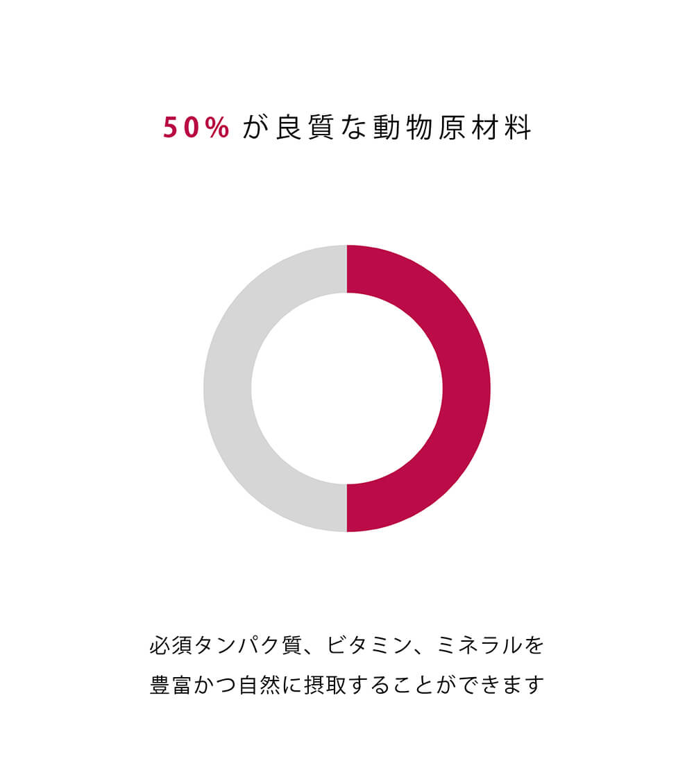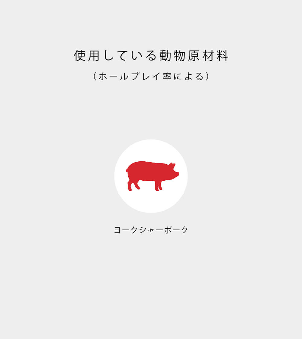※ホールプレイ:肉食動物が摂るべき食事に合わせた割合で、肉や魚などの動物原材料の内臓部分(心臓、レバー、腎臓など)・少量の骨をそのまま使用すること