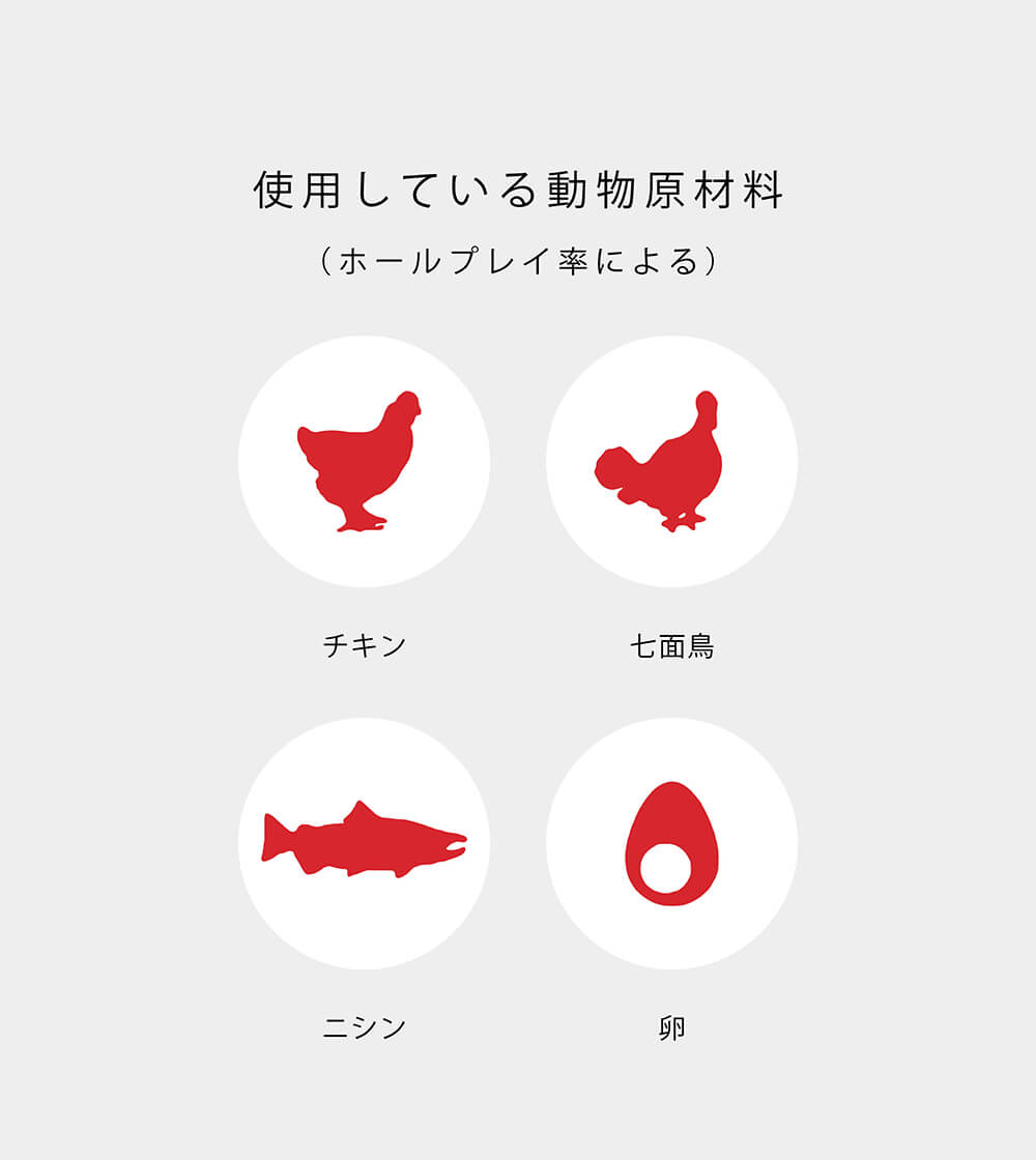 | 保証成分値 | 粗たんぱく質:35%以上、脂肪分:17%以上、粗繊維:6%以下、粗灰分:7%以下、水分:12%以下、カルシウム:1.5%以上、リン:1.1%以上、オメガ6:2.6%以上、オメガ3:0.9%以上、DHA:0.2%以上、EPA:0.2%以上 |