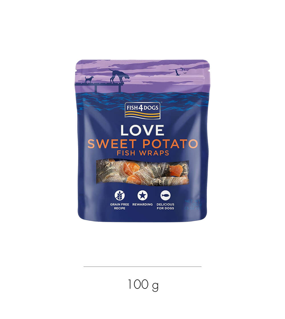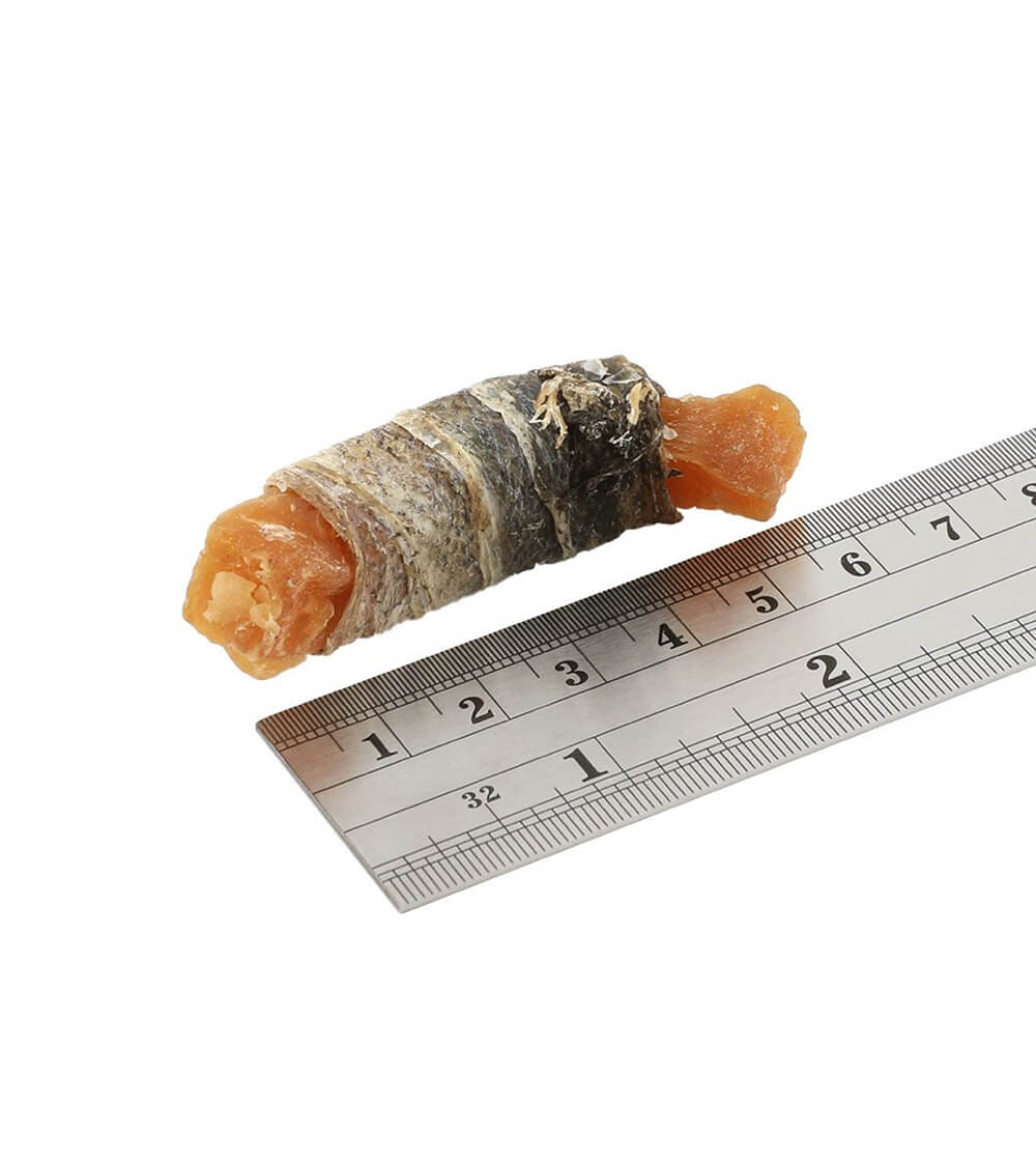 カリウムとビタミンが豊富なさつまいもをホワイトフィッシュの皮で巻いた、シンプルで嗜好性抜群のトリーツです。