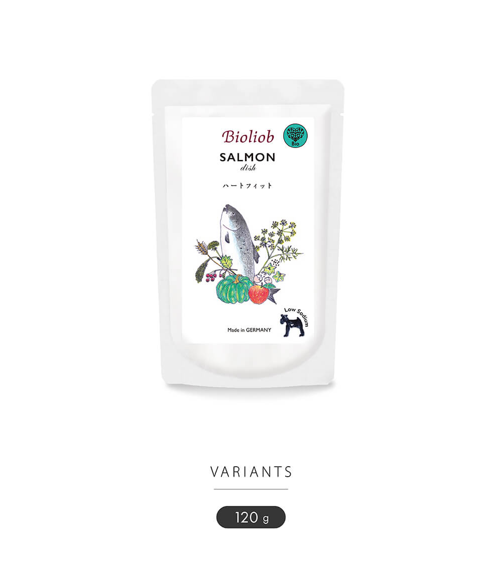 主タンパク源は、EPA・DHAの供給源となるビオの北欧サーモンをメインに、フラボノイドが豊富なビオのホーソンベリー、カリウムの供給源であるビオのダンデライオン、オメガ-3脂肪酸やビタミンEを多く含むグリーンナッツ油を使用。低ナトリウム*の獣医師監修メニューです。