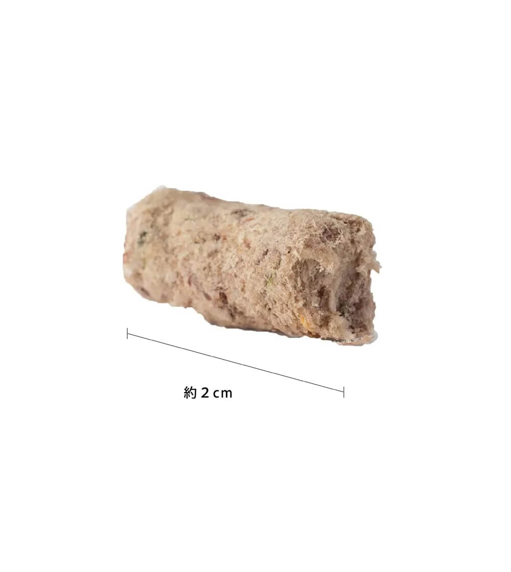 | 素材 | 鶏肉、肝臓(鶏)、フラックスシードフレーク、ホキ(白身魚)オイル、にんじん、ニュージーランド緑イ貝、かぼちゃ、ブロッコリー、乾燥昆布、リン酸二カリウム、ビタミンE、塩化ナトリウム、ミネラル類(プロティネイト亜鉛、プロティネイト鉄、酸化マグネシウム、セレン酵母、プロティネイト胴、プロティネイトマンガン)、ビタミン類(ビタミンB1、ベータカロチン、葉酸)、ビタミンD3 |
