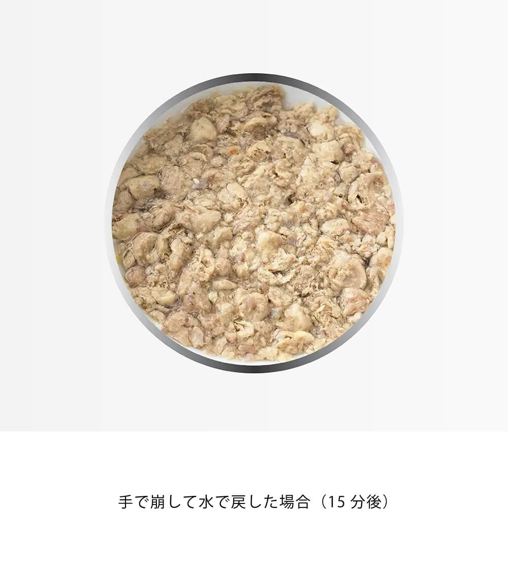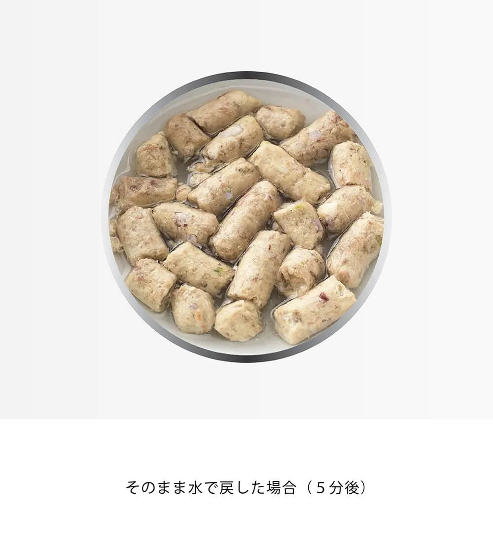 水で戻すと食感も食物酵素の多さも生食そっくりに。嗜好性が高くとても食べやすいので、まだ生食に慣れていないパートナー(愛犬)にもおすすめです。