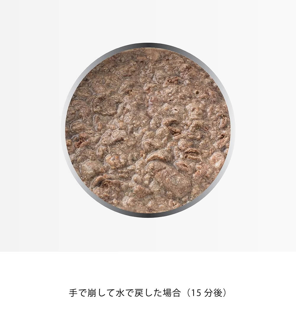 ※フリーズドライに水やぬるま湯を加えても、膨らんだりしません。