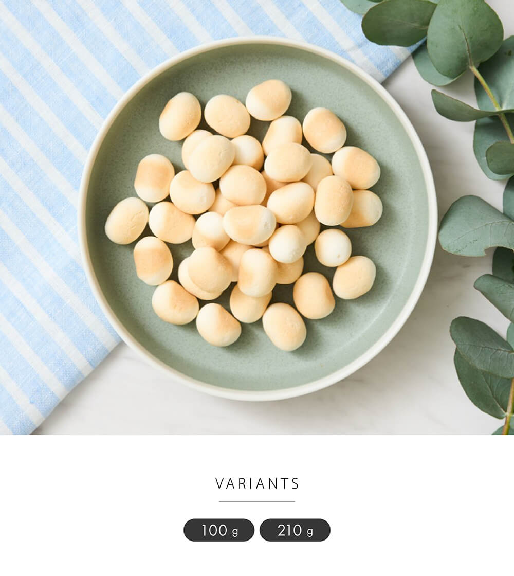 | 原材料 | 馬鈴薯澱粉(北海道)、砂糖、水飴、液全卵、ぶどう糖、小麦粉、脱脂粉乳、寒梅粉ミックス(とうもろこし澱粉、もち米) |