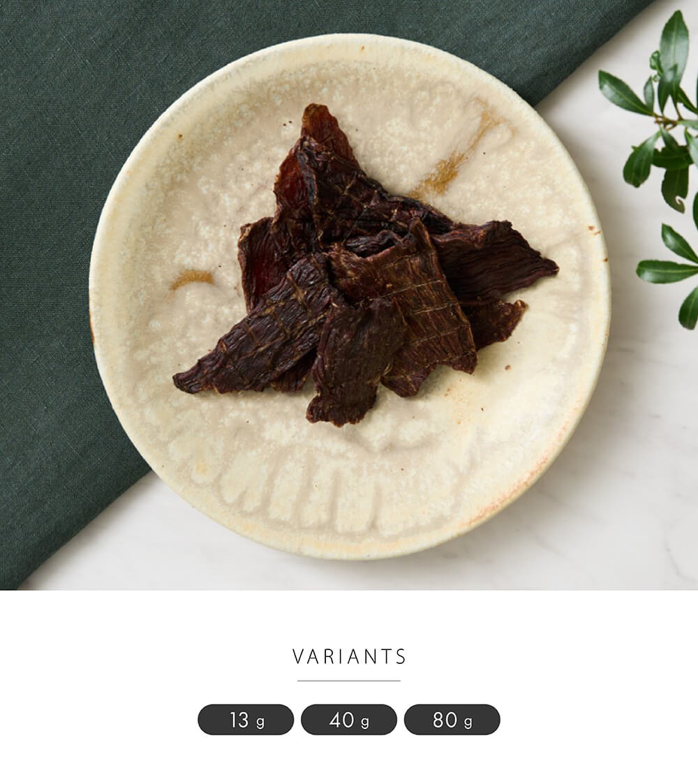 国産牛(主には北海道、岡山・中国地方)の赤身もも肉だけをスライスしてからじっくりと乾燥させました。