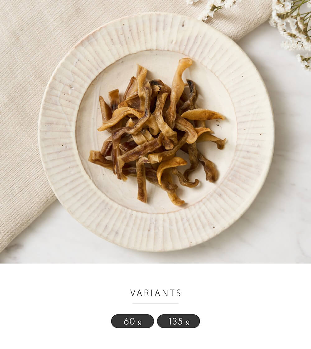 国産の豚の耳を小型犬にも食べ易いように細切りにしてからじっくり乾燥させました。
