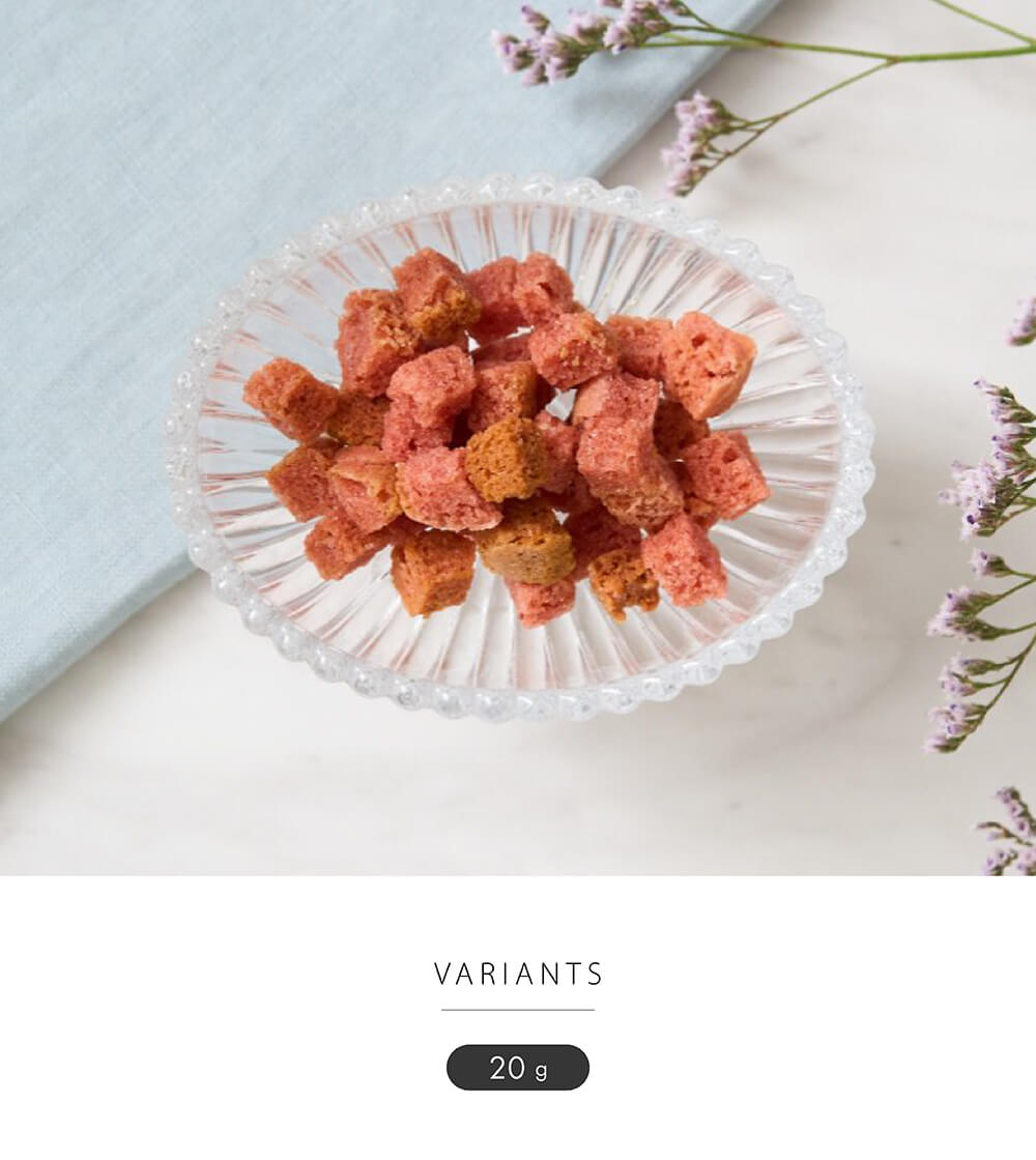 嗜好性の良い国産の鹿肉パウダーと苺を混ぜ込んだかわいいラスクです。