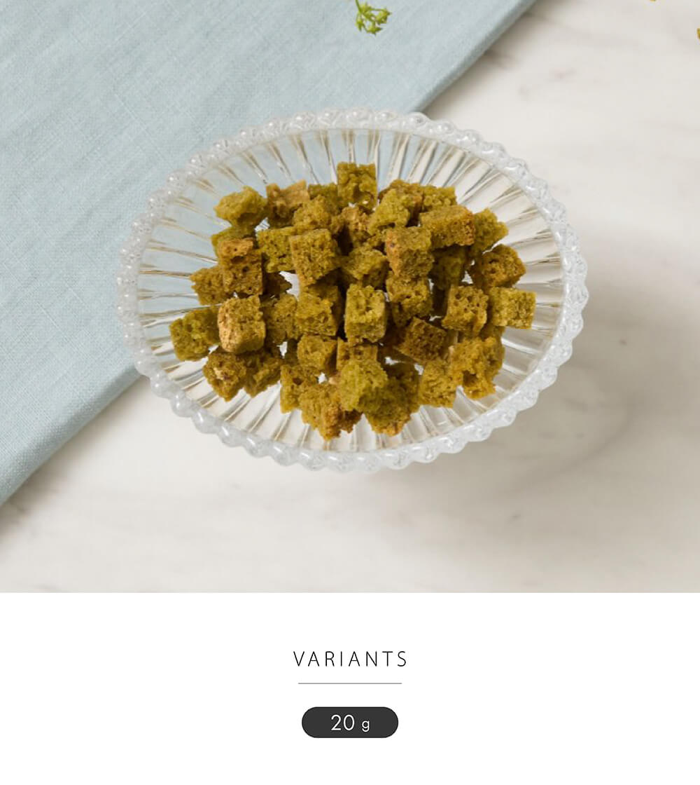 | 原材料 | 米粉、馬鈴薯澱粉、蜂蜜、オリーブオイル、ブロッコリーパウダー、鹿肉粉 |