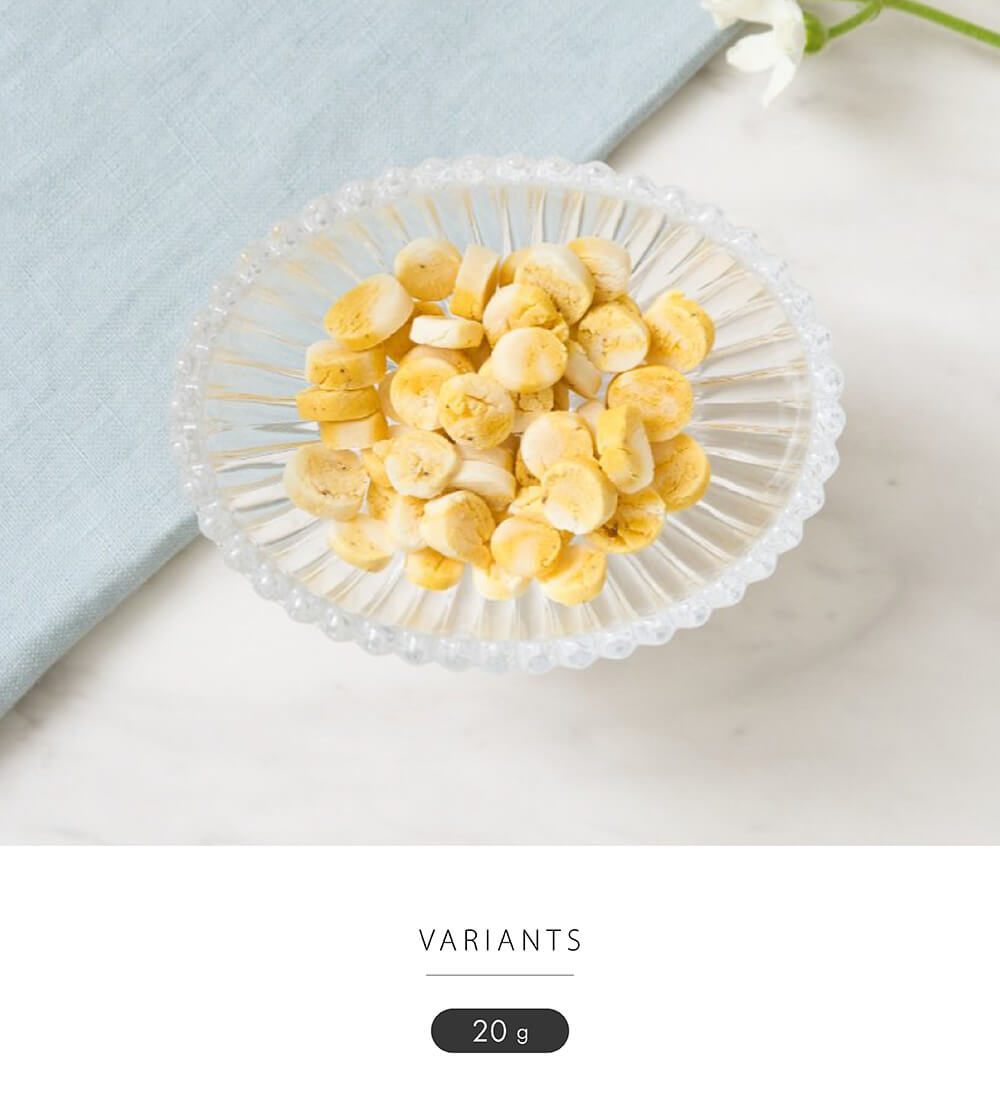 | 原材料 | 米粉、馬鈴薯澱粉、蜂蜜、かぼちゃパウダー、鹿肉粉、オリーブオイル |