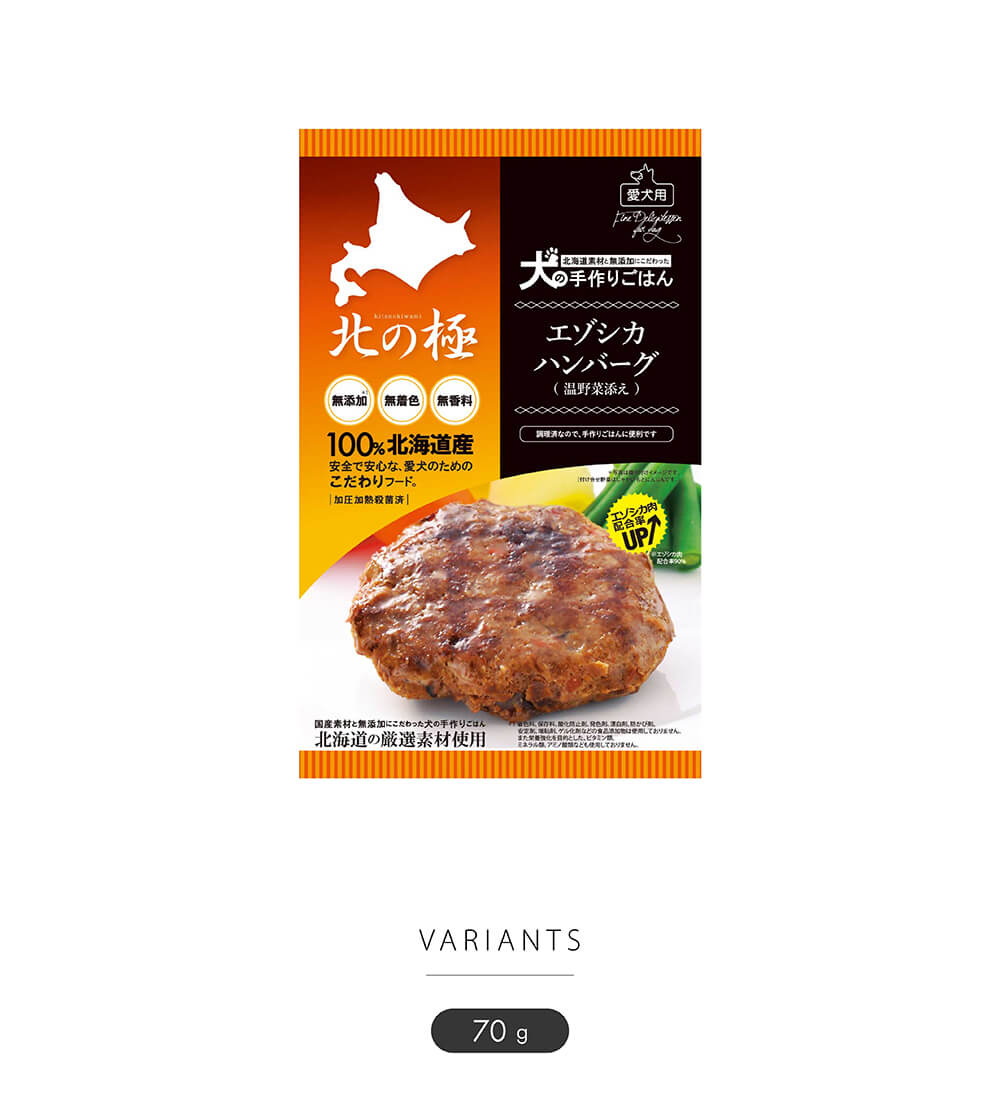 ハンバーグ:エゾシカ肉・パン粉(配合率10%) 温野菜:じゃがいも・にんじん ※原材料は全て北海道産を使用(国産) |