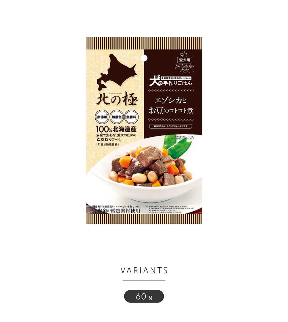 | 原材料 | エゾシカ肉、大豆、人参 ※原材料は全て北海道産を使用(国産) |