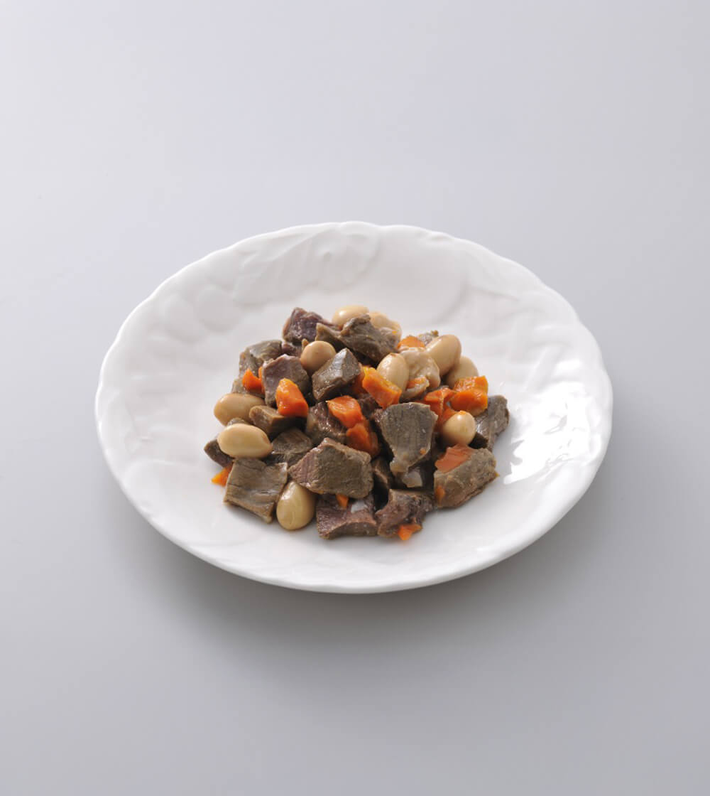 ヘルシーなエゾシカ肉を、大豆と人参と一緒に、丁寧にコトコト煮込みました。