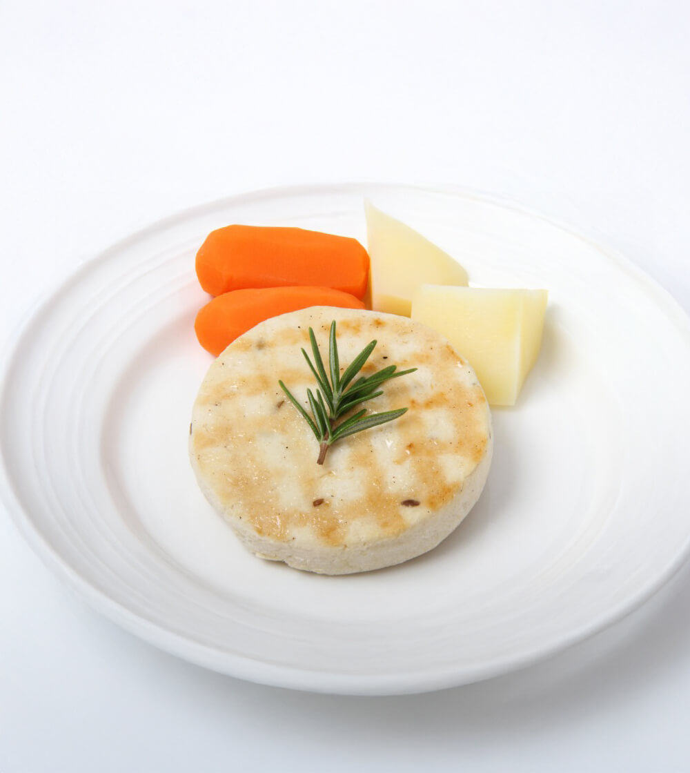鶏のハンバーグに付け合わせの温野菜が付いています。手作りメニューとしてお召し上がりください。