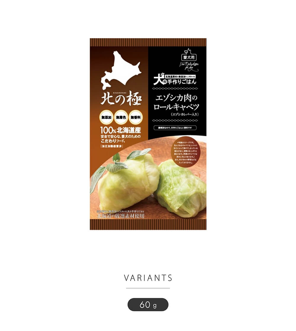 | 原材料 | エゾシカ肉、エゾシカレバー※原材料は全て北海道産を使用(国産) |