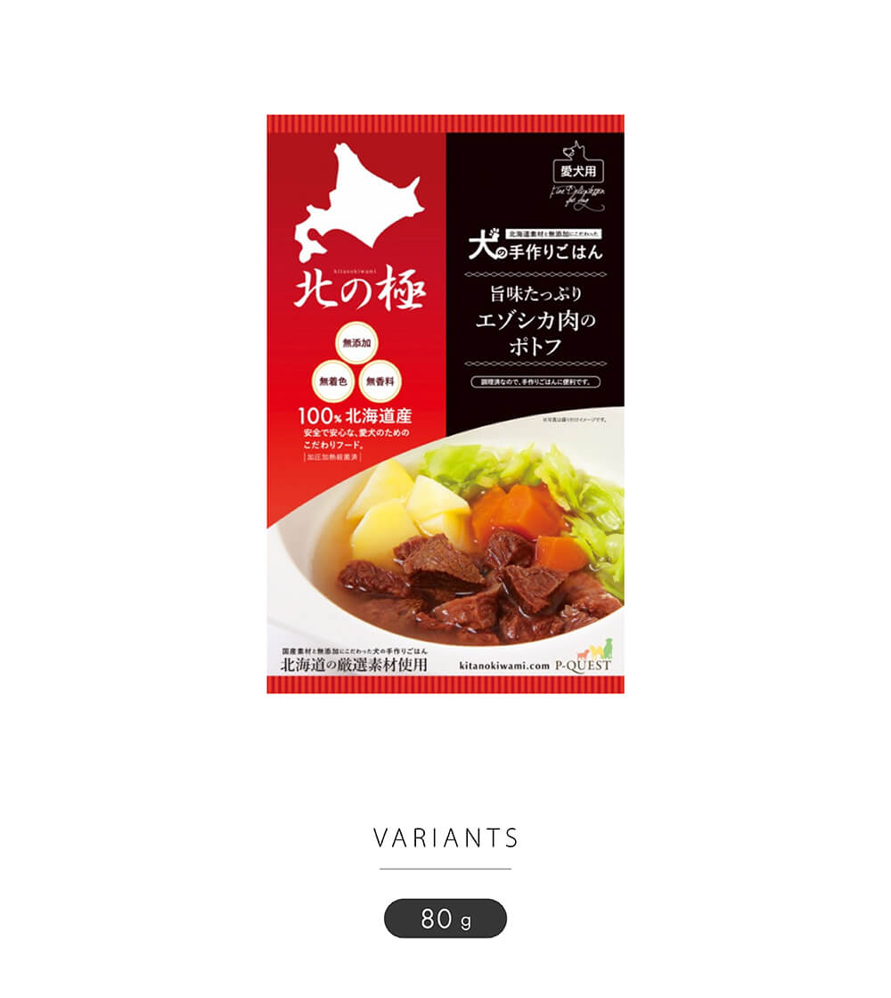 | 原材料 | エゾシカモモ肉、シカ肉スープ、人参、じゃがいも、キャベツ ※原材料はすべて国産 |