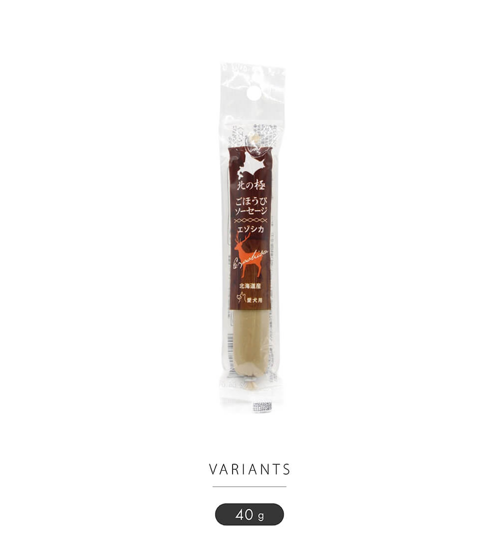 | 原材料 | 鹿肉(エゾ鹿)、でん粉(馬鈴薯澱粉)、塩(0.006g使用) |