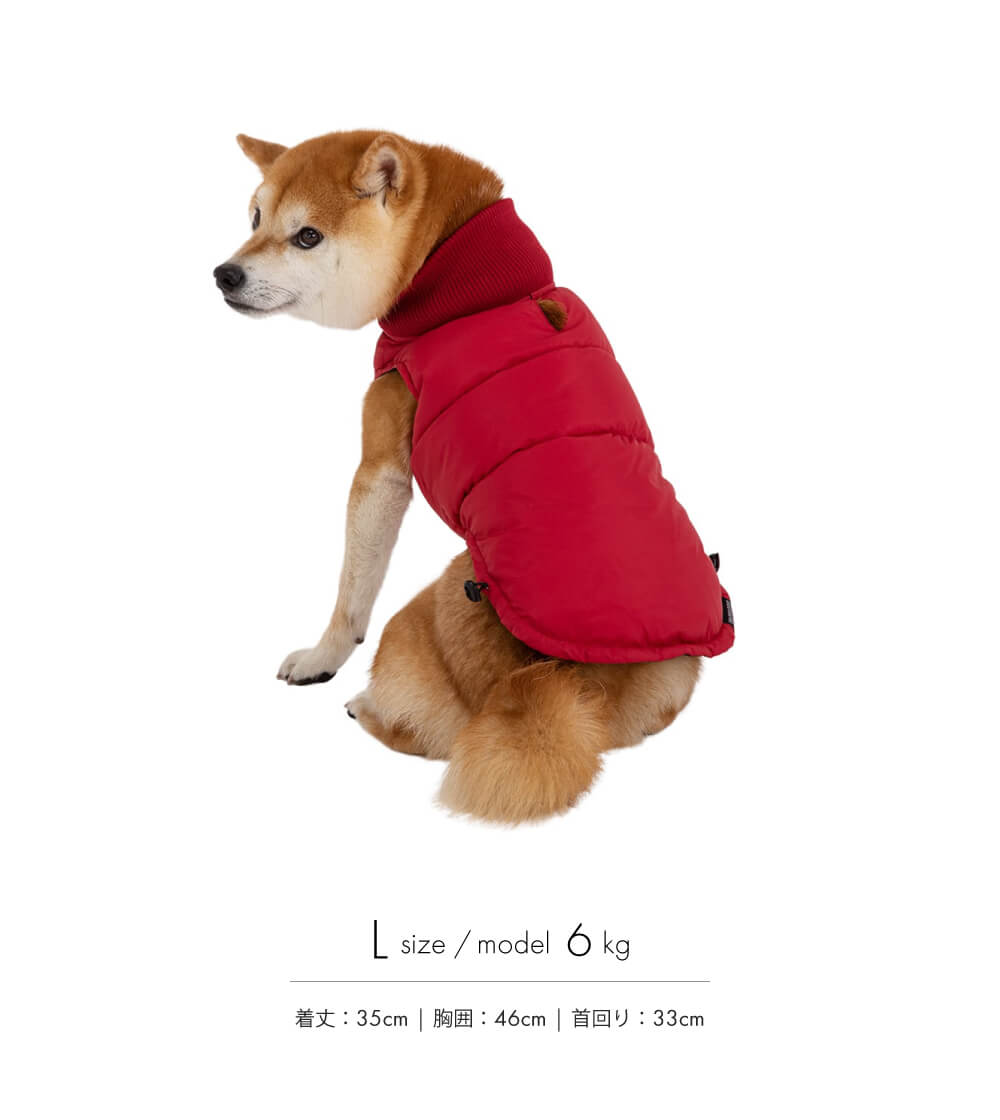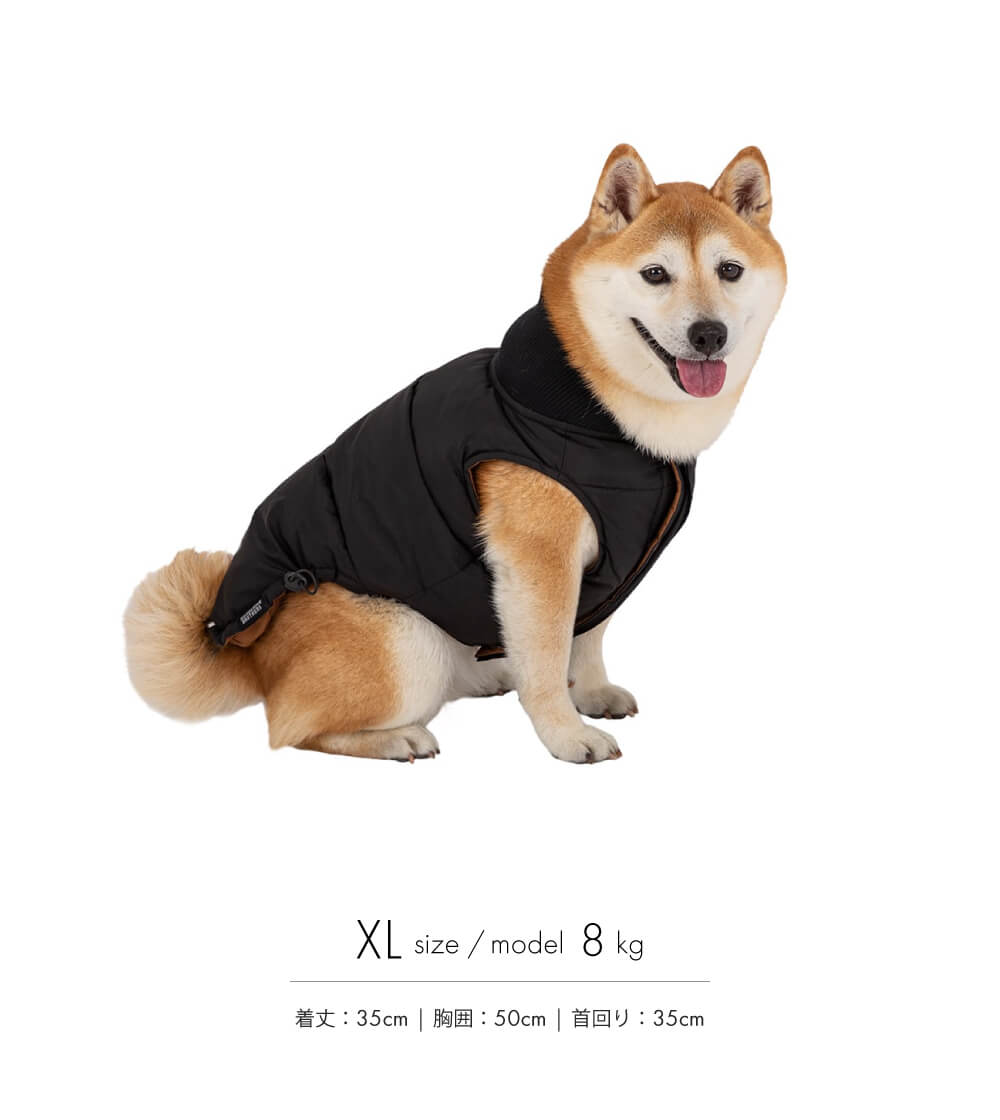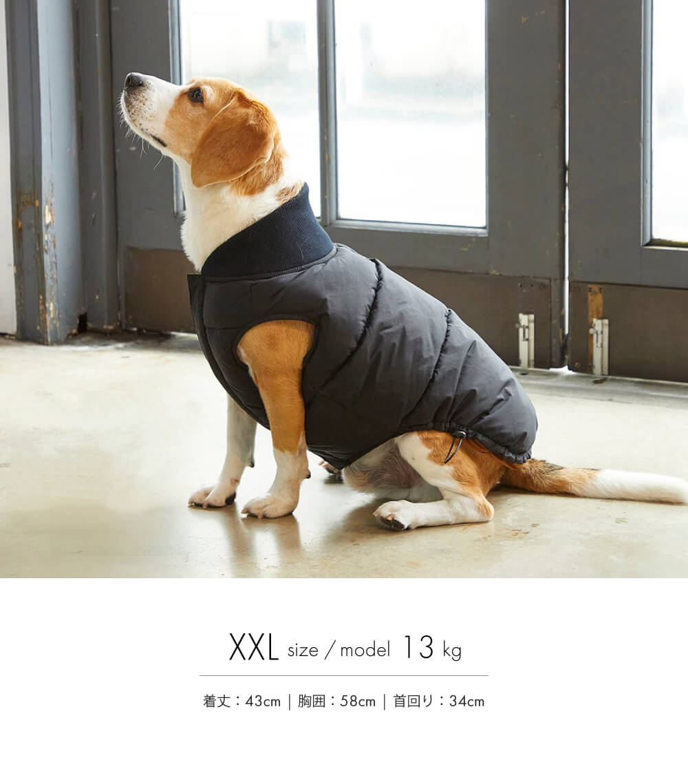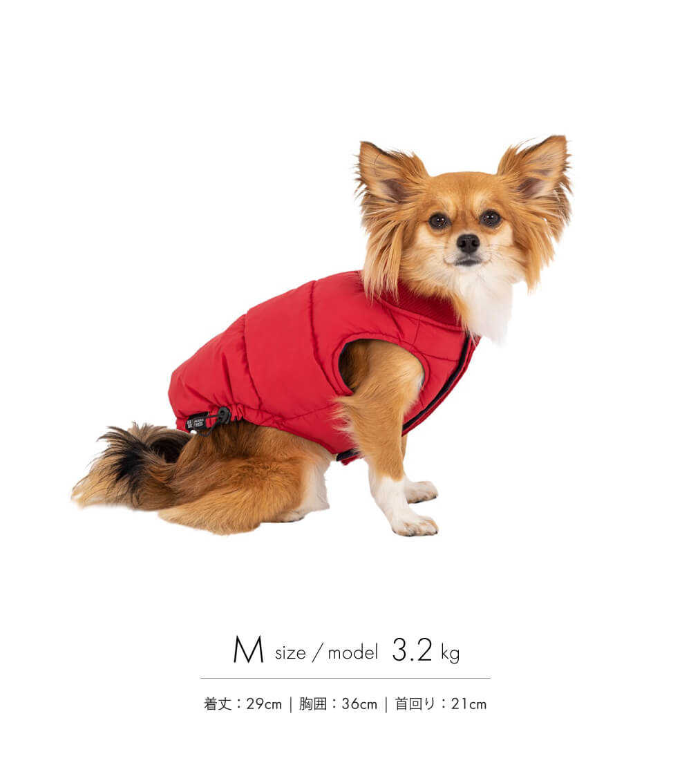 ※縫い縮みが発生する可能性がございますので、胸囲にゆとりを持ちつつモデル犬を参考にご検討ください。