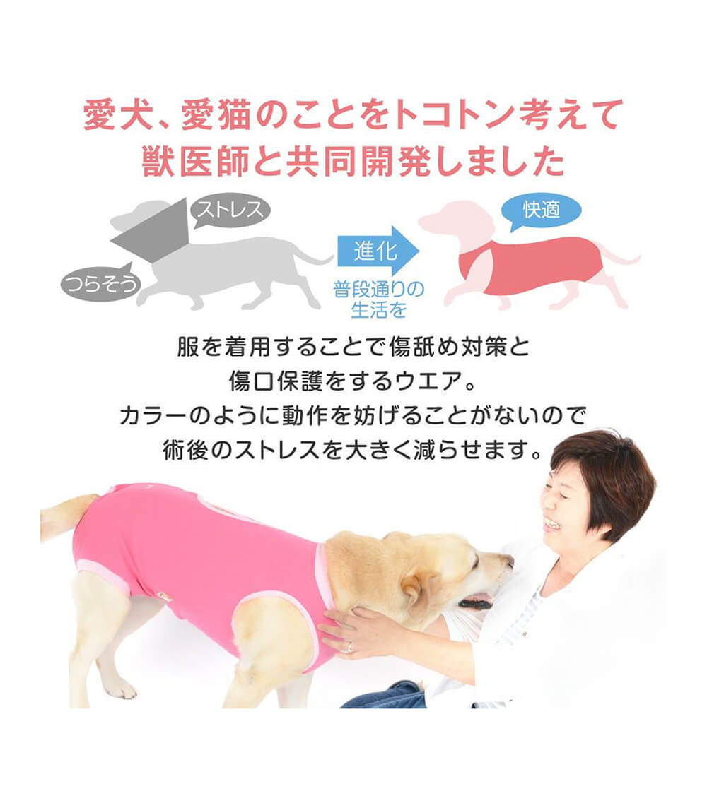 「カラーが可哀そう」「傷口を気にしていた」そんな声に応えた、獣医師さんと共同開発した我が子のための思いやりウェアです。