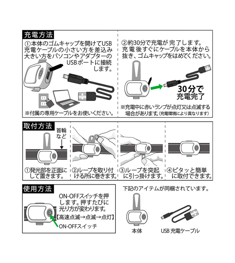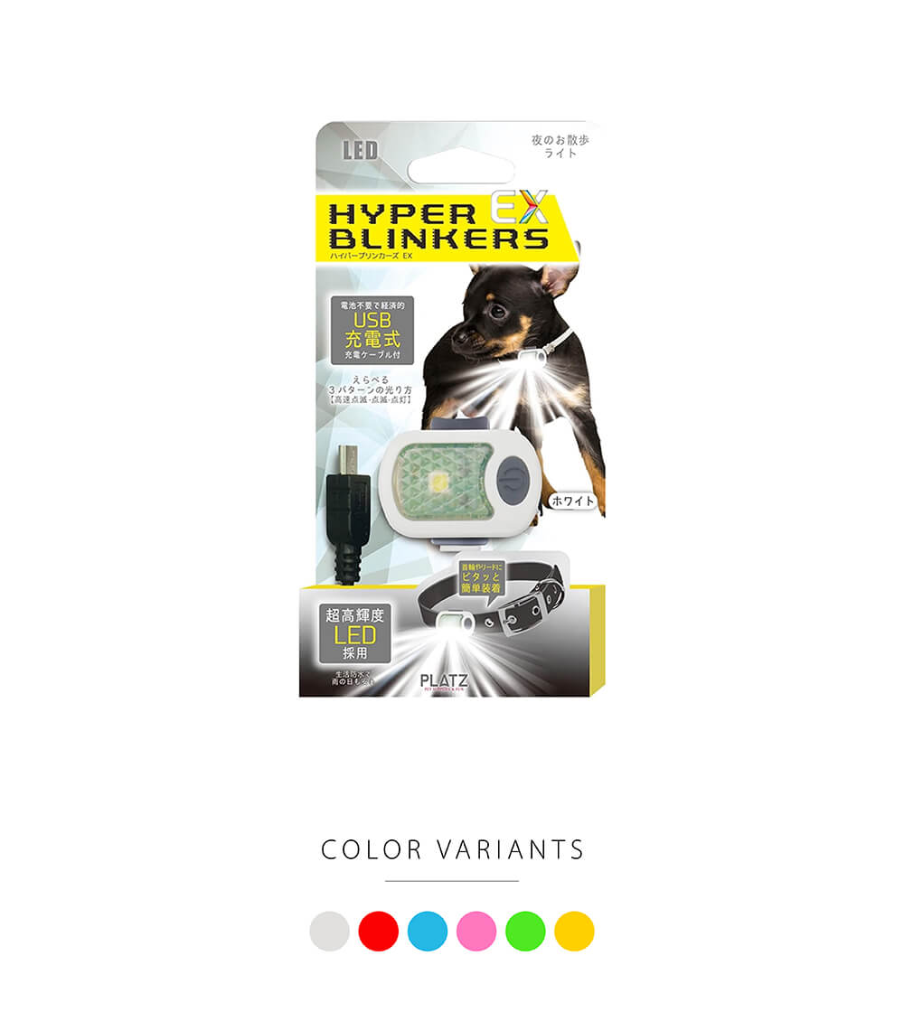 USB充電式・お散歩ライトの定番品。 コンパクトなのにハイパワーな、お散歩用の充電式LEDライトです。 光のカラーを選んで夜のお散歩が楽しめる、カラービームタイプ。 光のパターンは3種類で、高速点滅・点滅・点灯から選べます。