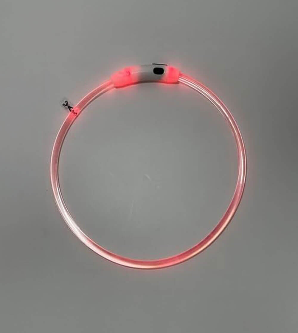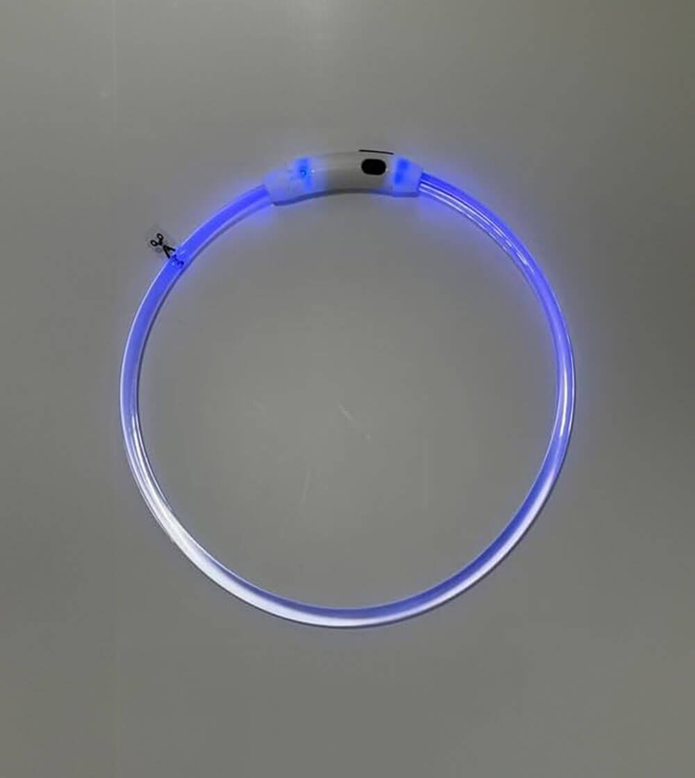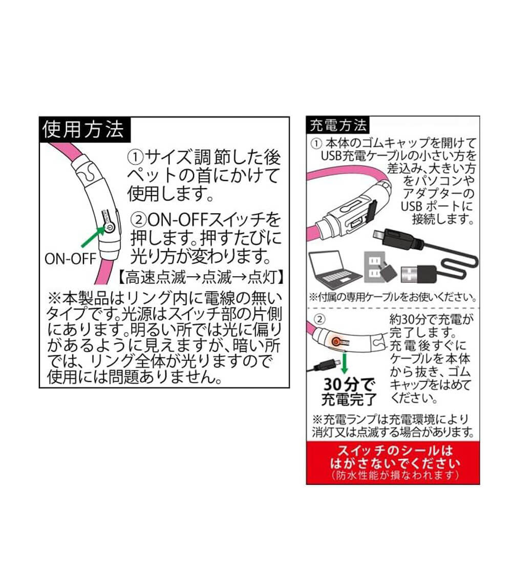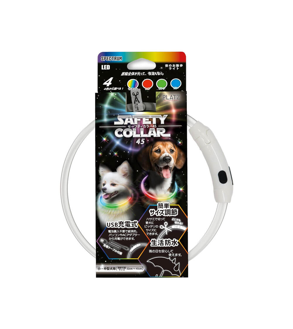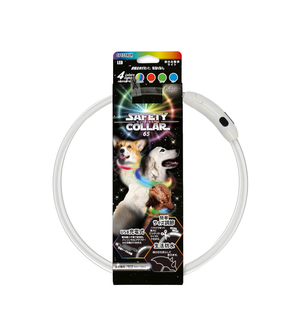 大人気のお散歩用ライト”セーフティカラー”から新たなタイプが登場! マルチカラー・レッド・グリーン・ブルーの4パターンの光り方がスイッチひとつで選択可能。 USB充電式で、パソコンやACアダプターから充電ができ、サイズ調節も簡単です。 充電時間は約30分、連続使用時間はマルチカラーの場合→約4時間、単色の場合→約3時間となっています。 ※充電環境により、充電時間・使用時間は異なる場合があります。