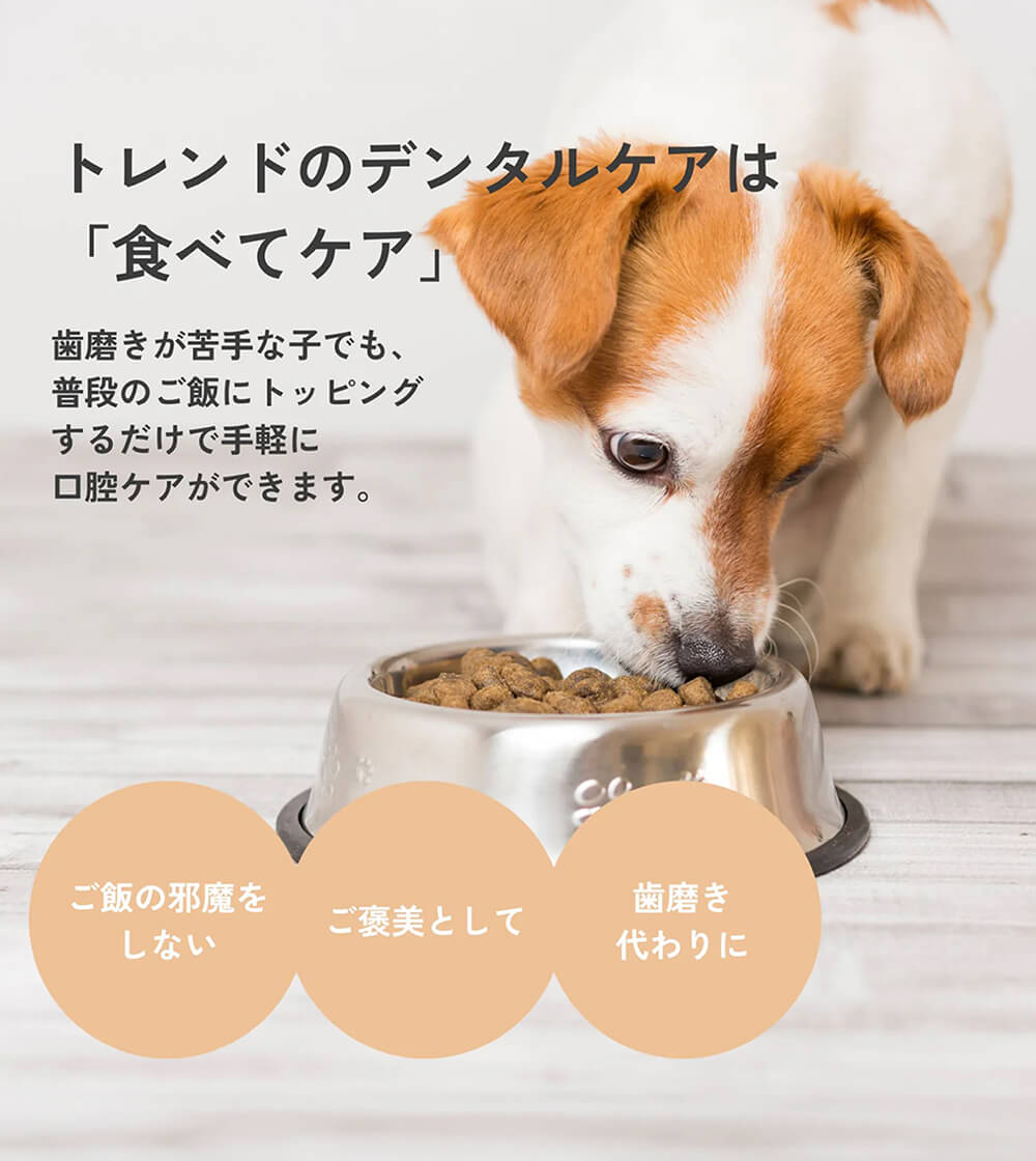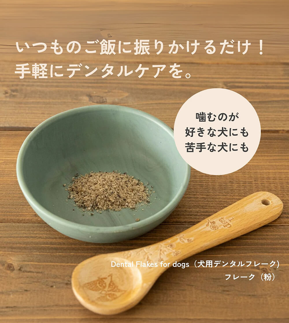 いつものドッグフードやおやつに適量をふりかけるだけで、フレークがお口全体に広がり、清潔な状態を保つことをサポートします。