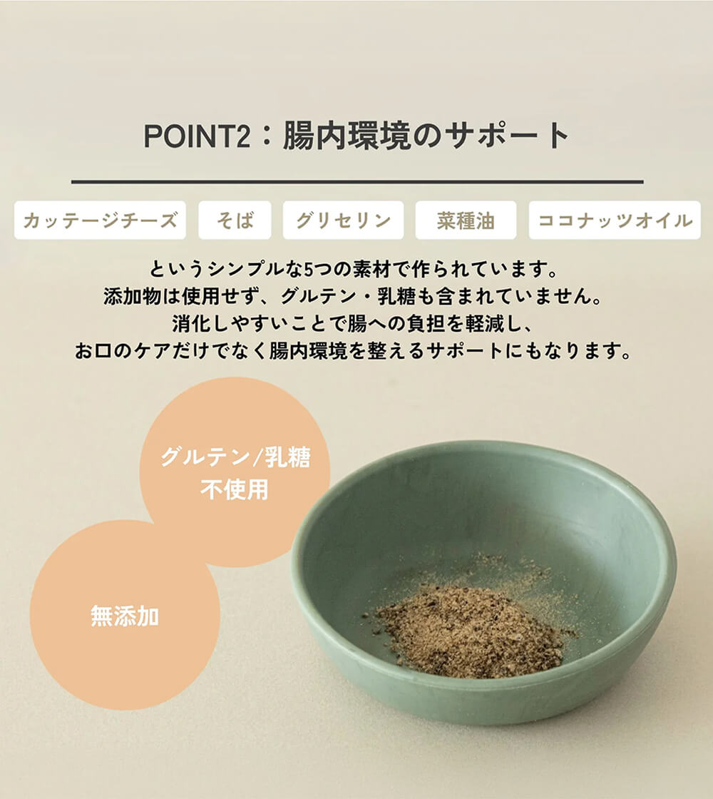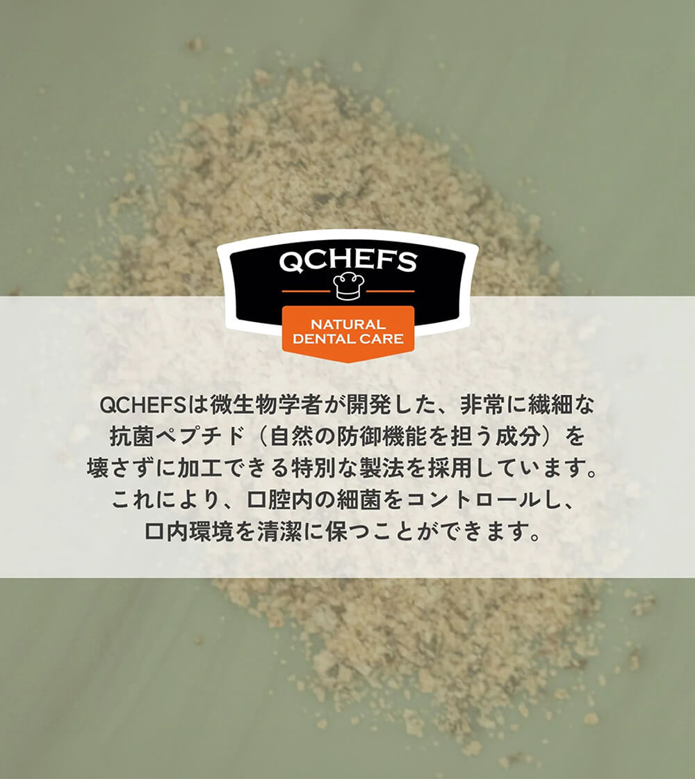 QCHEFSは、しっかりと噛んで口の中にひろがることで歯垢・歯石・口臭などのお口のケアに加えて、さらに消化しやすい100%天然由来の素材を使用し、腸内環境の健康維持をサポートします。