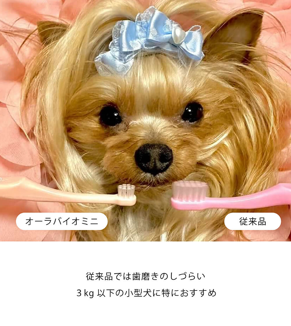 「オーラバイオブラシ ミニ」は、歯ブラシヘッドが綿棒サイズに近い、極小ヘッドの犬用歯ブラシです。