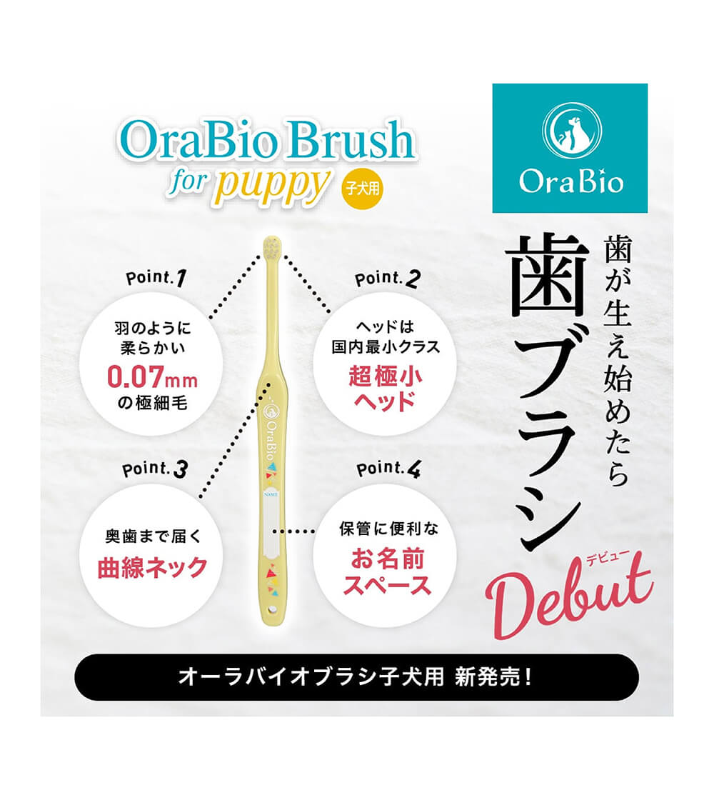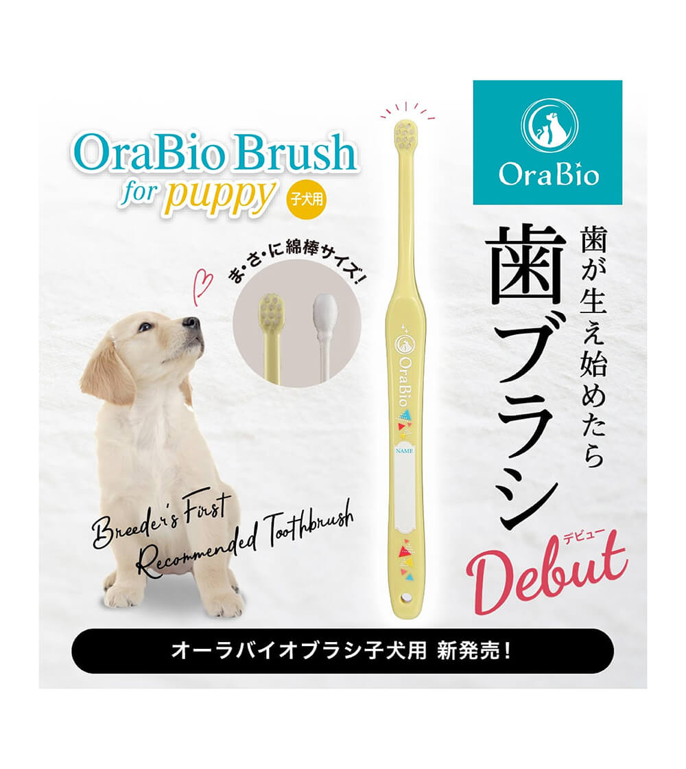 「オーラバイオブラシ 子犬用」は、歯ブラシヘッドが綿棒サイズに近い、極小ヘッドの犬用歯ブラシです。