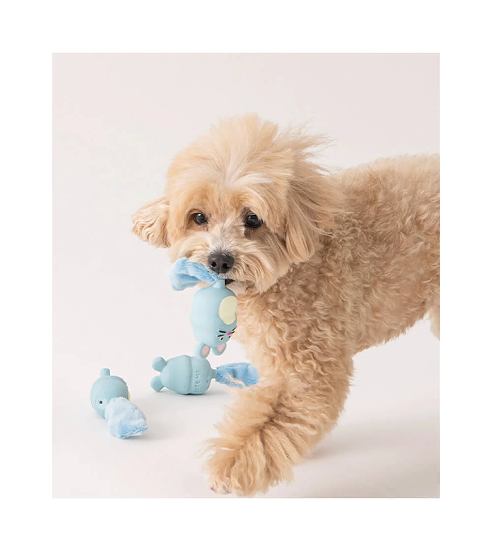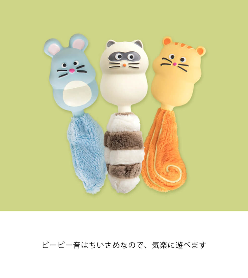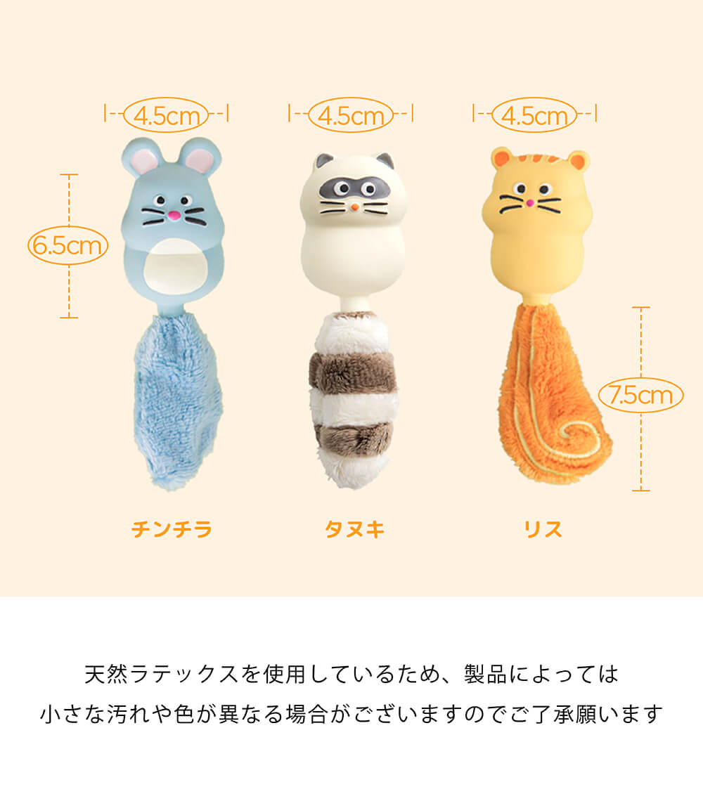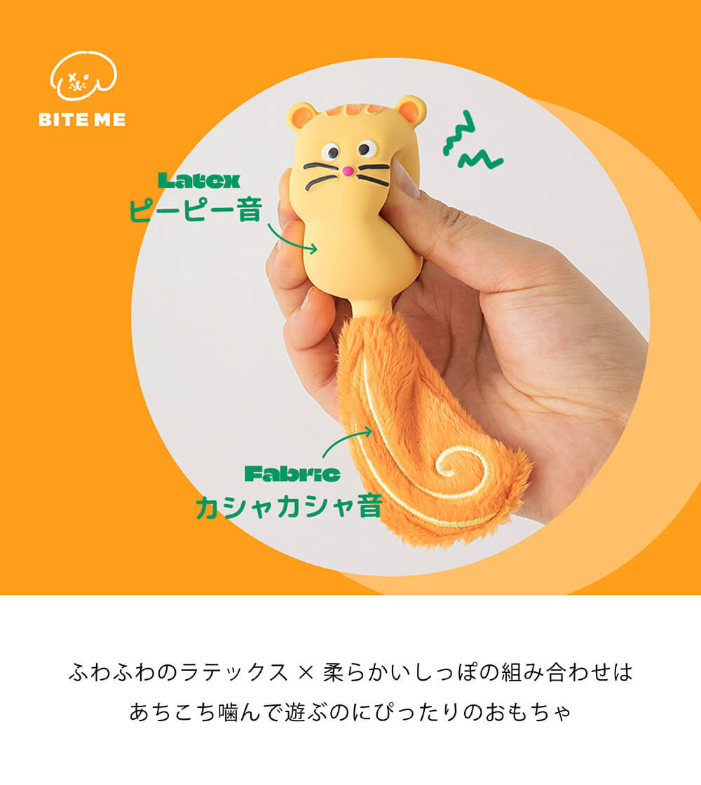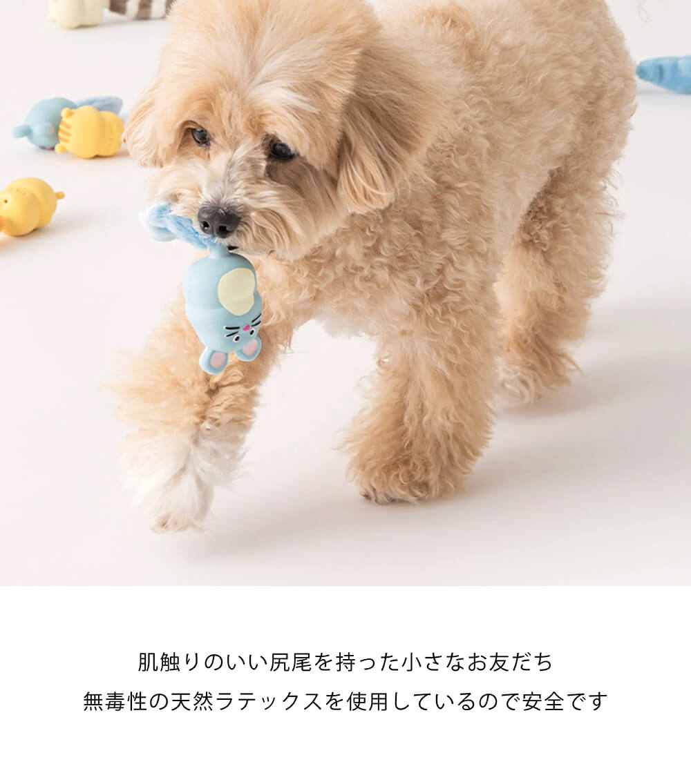 ふわふわのラテックスと柔らかいしっぽの組み合わせはあちこち噛んで遊ぶのにぴったりです。