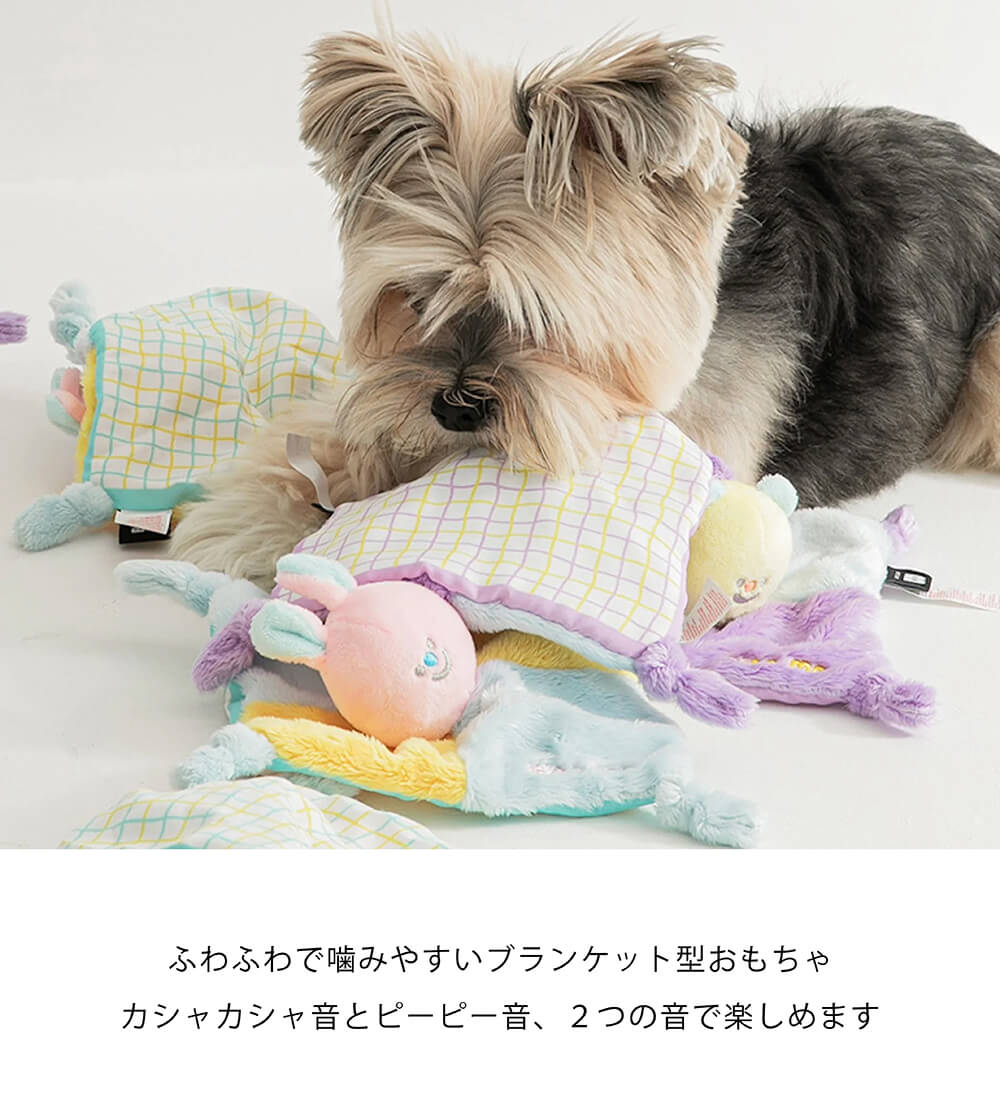 ブランケットの4角は結ばれていて、わんちゃんが噛み噛み楽しめるようになっています。