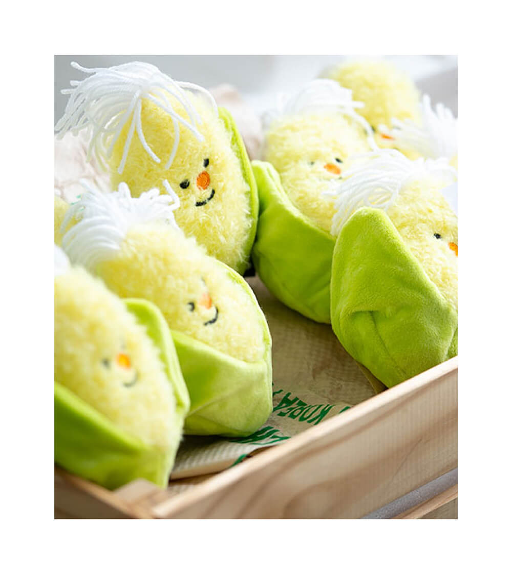 農産物シリーズの中でも特に人気のとうもろこしのおもちゃは、頭からはピーピー音、皮の部分はシャカシャカ音が鳴るようになっています。
